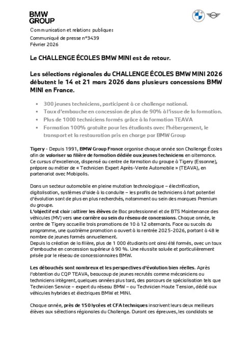 Depuis 1991, BMW Group France organise chaque année son Challenge Écoles afin de valoriser sa filière de formation dédiée aux jeunes techniciens en alternance. Ce cursus d’excellence, dispensé au centre de formation du groupe à Tigery (Essonne), prépare au métier de « Technicien Expert Après-Vente Automobile » (TEAVA), en partenariat avec Mobipolis.