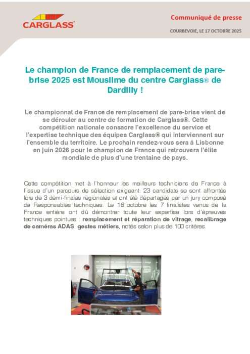 Le championnat de France de remplacement de pare-brise vient de se dérouler au centre de formation de Carglass. Cette compétition nationale consacre l’excellence du service et l’expertise technique des équipes Carglass qui interviennent sur l’ensemble du territoire. Le prochain rendez-vous sera à Lisbonne en juin 2026 pour le champion de France qui retrouvera l’élite mondiale de plus d’une trentaine de pays.