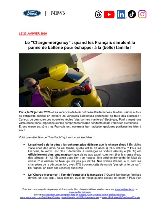 Les vacances de Noël ont beau être terminées, les discussions autour de l'étiquette sociale en matière de véhicules électriques continuent de faire des étincelles ! Curieux de décrypter ces nouvelles règles “des bonnes manières” électrique, Ford a mené une vaste étude pan-européenne sur les comportements des conducteurs de véhicules électriques. Et une chose est sûre : les Français ont, comme à leur habitude, quelques particularités bien à eux.