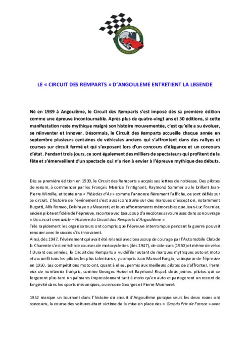Né en 1939 à Angoulême, le Circuit des Remparts s’est imposé dès sa première édition comme une épreuve incontournable. Après plus de quatre-vingt ans et 50 éditions, si cette manifestation reste mythique malgré son histoire mouvementée, c’est qu’elle a su évoluer, se réinventer et innover. Désormais, le Circuit des Remparts accueille chaque année en septembre plusieurs centaines de véhicules anciens qui s’affrontent dans des rallyes et courses sur circuit fermé.