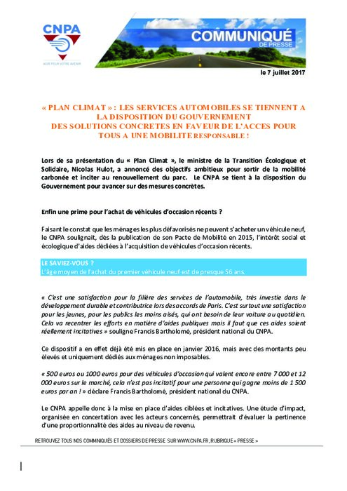 Lors de sa présentation du " Plan Climat ", le ministre de la Transition Écologique et Solidaire, Nicolas Hulot, a annoncé des objectifs ambitieux pour sortir de la mobilité carbonée et inciter au renouvellement du parc. Le CNPA se tient à la disposition du Gouvernement pour avancer sur des mesures concrètes.