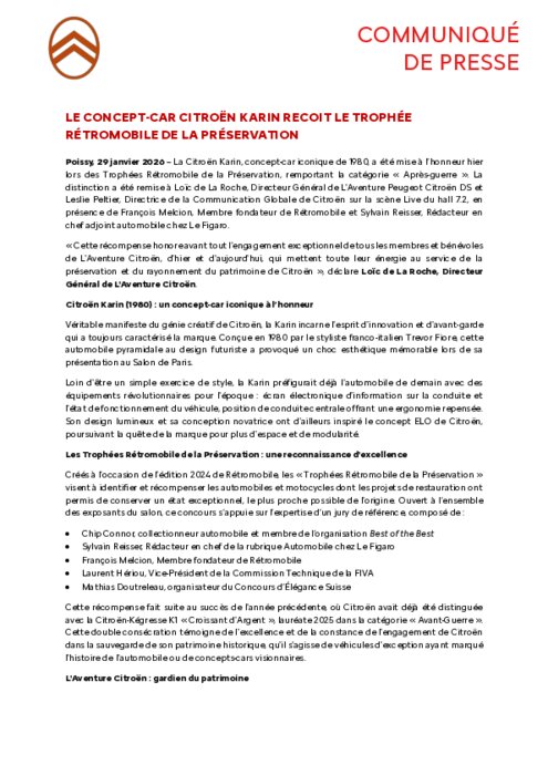 La Citroën Karin, concept-car iconique de 1980, a été mise à l’honneur hier lors des Trophées Rétromobile de la Préservation, remportant la catégorie « Après-guerre ». La distinction a été remise à Loïc de La Roche, Directeur Général de L'Aventure Peugeot Citroën DS et Leslie Peltier, Directrice de la Communication Globale de Citroën sur la scène Live du hall 7.2, en présence de François Melcion, Membre fondateur de Rétromobile et Sylvain Reisser, Rédacteur en chef adjoint automobile chez Le Figaro.