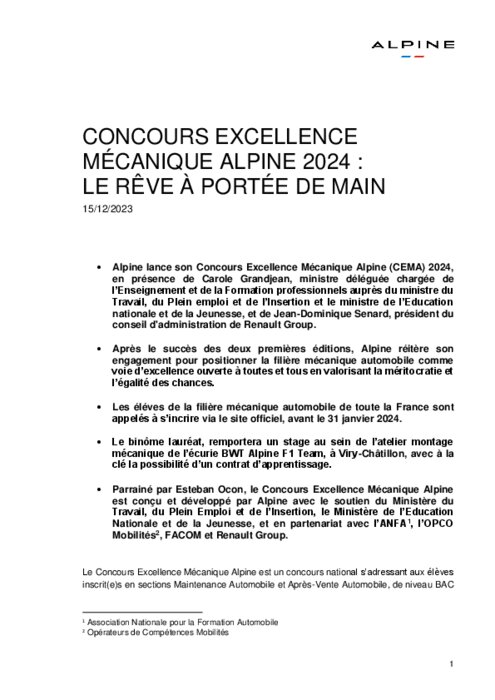 Depuis 2022, le Concours Excellence Mécanique Alpine permet de mettre en lumière le savoir-être et le savoir-faire des jeunes élèves et apprenti(e)s de la filière mécanique. Grâce à ce concours, quatre jeunes élèves de la filière mécanique automobile ont déjà pu faire un stage au sein de l’atelier montage mécanique de l’écurie BWT Alpine F1 Team à Viry-Châtillon.