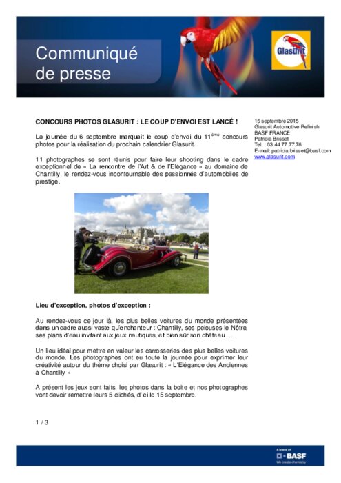 La journée du 6 septembre marquait le coup d’envoi du 11ème concours photos pour la réalisation du prochain calendrier Glasurit. 11 photographes se sont réunis pour faire leur shooting dans le cadre exceptionnel de « La rencontre de l’Art & de l’Elégance » au domaine de Chantilly, le rendez-vous incontournable des passionnés d’automobiles de prestige.