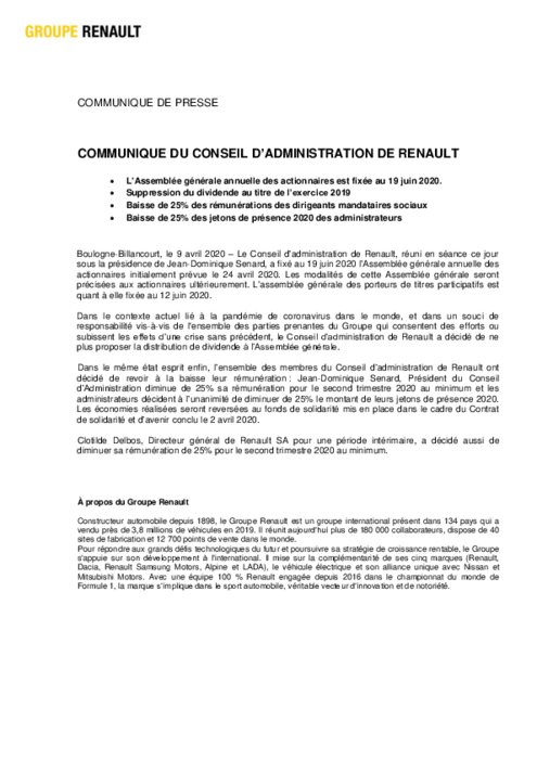 Le Conseil d’administration de Renault, réuni en séance ce jour sous la présidence de Jean-Dominique Senard, a fixé au 19 juin 2020 l’Assemblée générale annuelle des actionnaires initialement prévue le 24 avril 2020. Les modalités de cette Assemblée générale seront précisées aux actionnaires ultérieurement. L’assemblée générale des porteurs de titres participatifs est quant à elle fixée au 12 juin 2020.