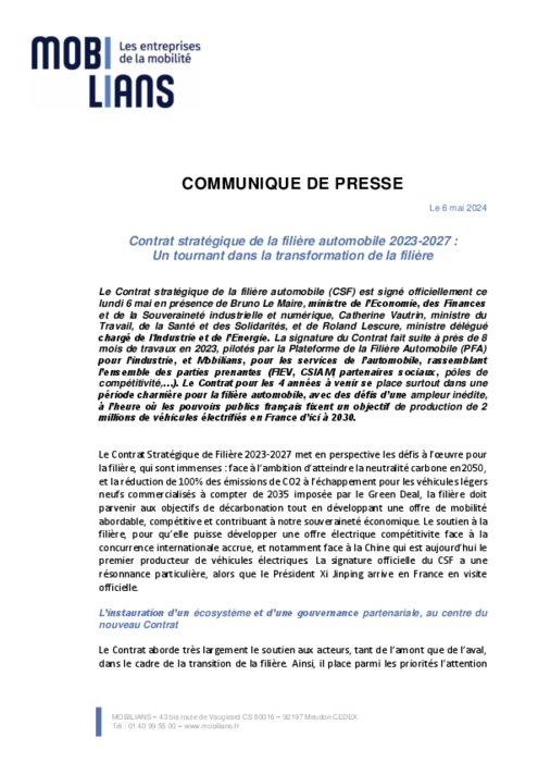 Le Contrat stratégique de la filière automobile (CSF) est signé officiellement ce lundi 6 mai en présence de Bruno Le Maire, ministre de l’Economie, des Finances et de la Souveraineté industrielle et numérique, Catherine Vautrin, ministre du Travail, de la Santé et des Solidarités, et de Roland Lescure, ministre délégué chargé de l'Industrie et de l’Energie.