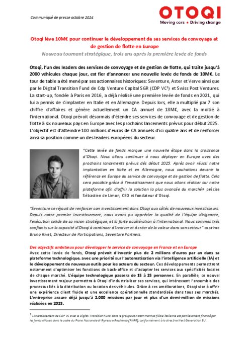 Otoqi, l’un des leaders des services de convoyage et de gestion de flotte, qui traite jusqu’à 2000 véhicules chaque jour, est fier d’annoncer une nouvelle levée de fonds de 10M€. Le tour de table a été mené par ses actionnaires historiques: Seventure, Aster et Verve ainsi que par le Digital Transition Fund de Cdp Venture Capital SGR (CDP VC) et Swiss Post Ventures.