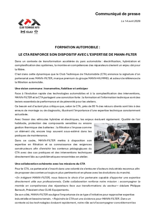 Dans un contexte de transformation accélérée du parc automobile : électrification, hybridation et complexification des systèmes, la montée en compétences des réparateurs devient un enjeu clé pour la filière. C’est dans cette dynamique que le Club Technique de l’Automobile (CTA) annonce la signature d’un partenariat avec Mann-Filter, marque premium du groupe Mann+Hummel et acteur de référence de la filtration automobile.