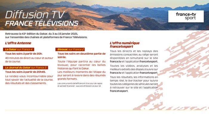 Retrouvez la 43ème édition du Dakar, du 3 au 15 janvier 2021, sur l’ensemble des chaînes et plateformes de France Télévisions.