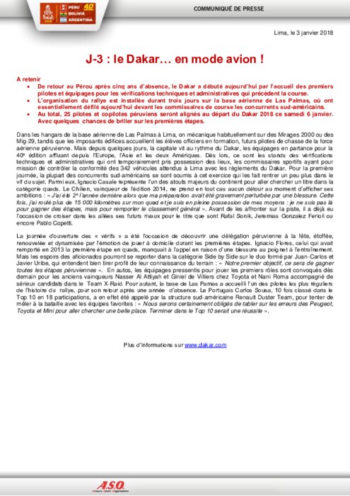De retour au Pérou après cinq ans d’absence, le Dakar a débuté jeudi 4 janvier par l’accueil des premiers pilotes et équipages pour les vérifications techniques et administratives qui précèdent la course. L’organisation du rallye est installée durant trois jours sur la base aérienne de Las Palmas, où ont essentiellement défilé devant les commissaires de course les concurrents sud-américains. Au total, 25 pilotes et copilotes péruviens seront alignés au départ du Dakar 2018 samedi 6 janvier.