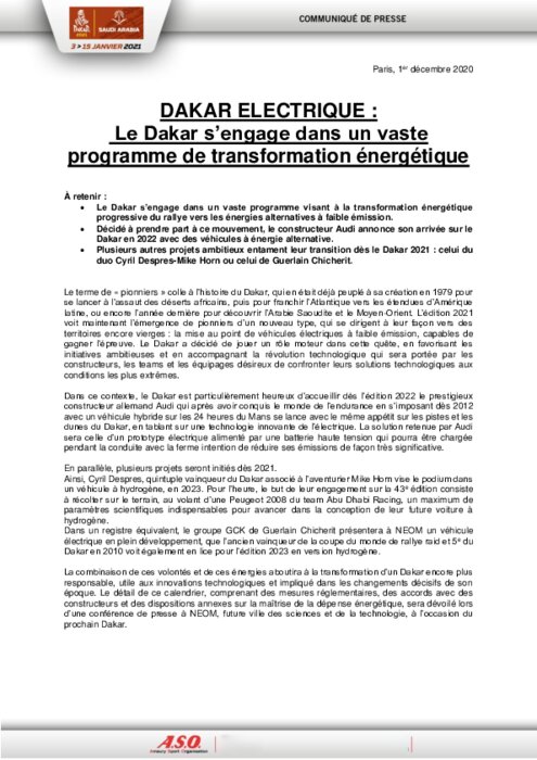Le Dakar s’engage dans un vaste programme visant à la transformation énergétique progressive du rallye vers les énergies alternatives à faible émission. Décidé à prendre part à ce mouvement, le constructeur Audi annonce son arrivée sur le Dakar en 2022 avec des véhicules à énergie alternative. Plusieurs autres projets ambitieux entament leur transition dès le Dakar 2021 : celui du duo Cyril Despres-Mike Horn ou celui de Guerlain Chicherit.