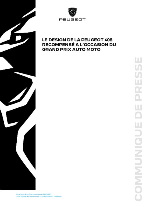 L a nouvelle PEUGEOT 408 a reçu le Prix du Style à l’occasion du Grand Prix Auto Moto décerné par la rédaction de ce média dans le cadre du Mondial de l’Automobile à Paris. Une récompense qui salue l’inventivité des équipes du design PEUGEOT, qui ont créé un e silhouette fastback inédite.