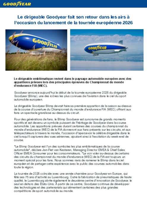 Le dirigeable emblématique revient dans le paysage automobile européen avec des apparitions prévues lors des principales épreuves du Championnat du monde d'endurance FIA (WEC). Goodyear annonce aujourd'hui le début de la tournée européenne 2026 du dirigeable Goodyear (Blimp), une des icônes les plus connues de l'aviation dans le ciel du sport automobile européen. Le dirigeable Goodyear Blimp devrait faire sa première apparition de la saison au-dessus de la course d’ouverture du Championnat du monde d’endurance FIA (WEC), offrant aux fans un spectacle grandiose au-dessus du circuit.