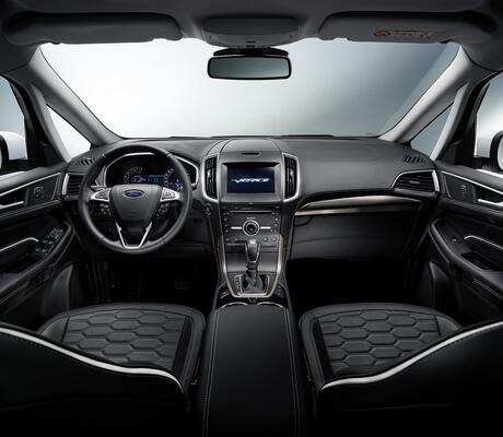 A l’intérieur, le Ford S-MAX Vignale propose un habitacle haut de gamme, avec l’utilisation de cuir Windsor matelassé avec surpiqûres hexagonales sur la sellerie et les contre-portes, dans des couleurs Cachemire ou Noir. L'accoudoir central, l’espace de rangement de la console centrale et le tableau de bord sont recouverts de cuir Noir.