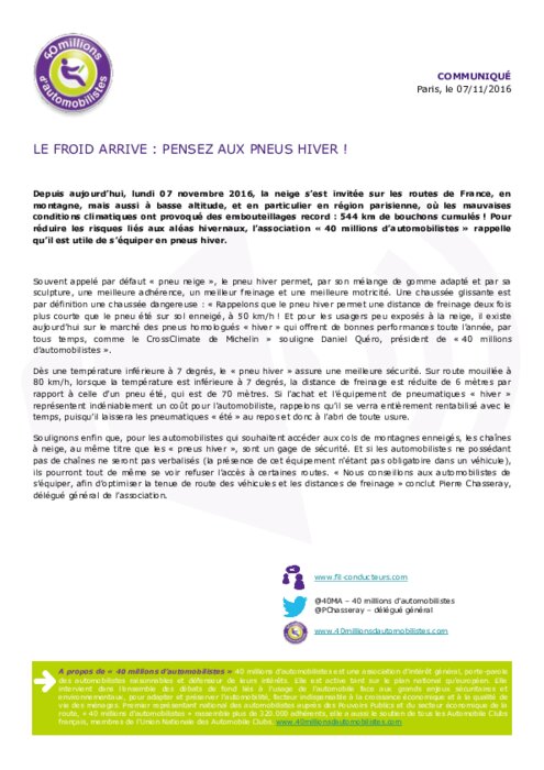 Depuis lundi 07 novembre 2016, la neige s'est invitée sur les routes de France, en montagne, mais aussi à basse altitude, et en particulier en région parisienne, où les mauvaises conditions climatiques ont provoqué des embouteillages record : 544 km de bouchons cumulés ! Pour réduire les risques liés aux aléas hivernaux, l'association " 40 millions d'automobilistes " rappelle qu'il est utile de s'équiper en pneus hiver.