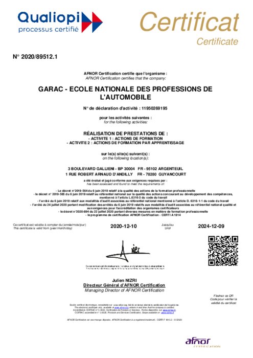 Le GARAC vient d’obtenir la Certification Qualiopi, une nouvelle certification exigée par la dernière loi de réforme de la formation professionnelle pour les organismes de formation, notamment par l’apprentissage. Sans certification, les organismes sont conduits à perdre les financements du marché conventionnel et des clients.