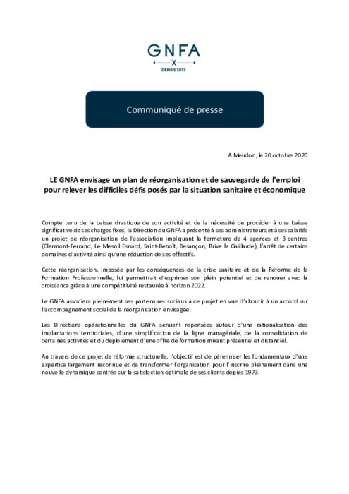 Compte tenu de la baisse drastique de son activité et de la nécessité de procéder à une baisse significative de ses charges fixes, la Direction du GNFA a présenté à ses administrateurs et à ses salariés un projet de réorganisation de l’association impliquant la fermeture de 4 agences et 3 centres (Clermont-Ferrand,Le Mesnil Esnard, Saint-Benoît, Besançon, Brive la Gaillarde), l’arrêt de certains domaines d’activité ainsi qu’une réduction de ses effectifs.
