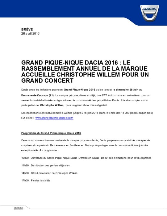 Dacia lance les invitations pour son Grand Pique-Nique 2016 qui se tiendra le dimanche 26 juin au Domaine de Courson (91). La marque prépare, d’ores et déjà, une 8ème édition riche en animations pour un moment convivial et totalement gratuit avec la communauté des propriétaires Dacia. Il faudra compter sur la participation de Christophe Willem, pour un grand show musical gratuit.