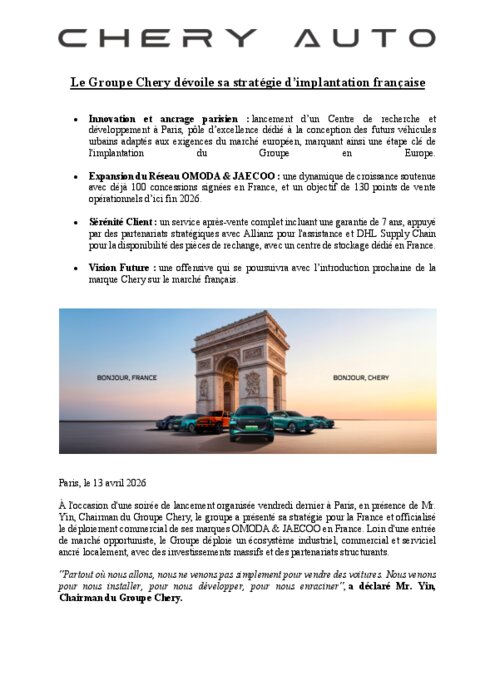 Innovation et ancrage parisien :lancement d’un Centre de recherche et développement à Paris, pôle d’excellence dédié à la conception des futurs véhicules urbains adaptés aux exigences du marché européen, marquant ainsi une étape clé de l'implantation du Groupe en Europe.