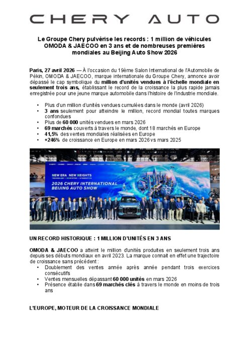 A l'occasion du 19ème Salon International de l'Automobile de Pékin, OMODA & JAECOO, marque internationale du Groupe Chery, annonce avoir dépassé le cap symbolique du million d'unités vendues à l'échelle mondiale en seulement trois ans, établissant le record de la croissance la plus rapide jamais enregistrée pour une jeune marque automobile dans l'histoire de l'industrie mondiale.