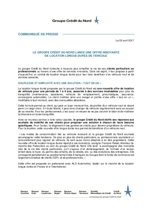 Le groupe Crédit du Nord s’attache à toujours plus simplifier la vie de ses clients particuliers ou professionnels au travers d’une offre de services innovants. Dans cet esprit, il leur propose à partir d’aujourd’hui un contrat de location longue durée pour leur faire bénéficier d’un véhicule neuf et de services associés.
