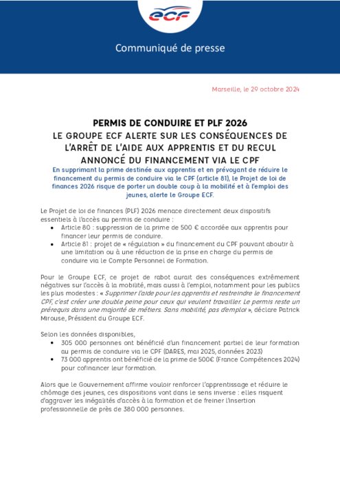 Services 29 octobre 2025 - 10:25 Le Projet de loi de finances 2026 menace deux dispositifs essentiels à l’accès au permis de conduire : la prime de 500 € destinée aux apprentis et le financement via le Compte Personnel de Formation (CPF). PDF (261 Ko) Télécharger