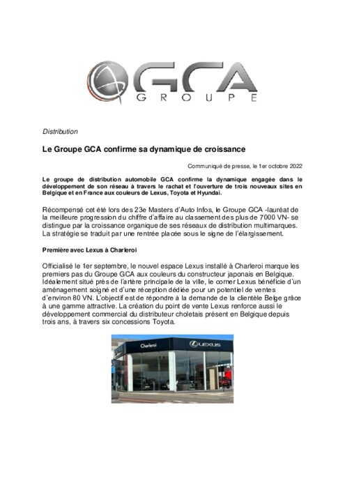 Constructeurs 06 octobre 2022 - 10:00 Le groupe de distribution automobile GCA confirme la dynamique engagée dans le développement de son réseau à travers le rachat et l'ouverture de trois nouveaux sites en Belgique et en France aux couleurs de Lexus, Toyota et Hyundai. PDF (283 Ko) Télécharger