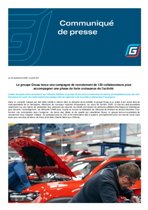 Dans un contexte marqué par des défis inédits à relever dans le domaine de la mobilité, le groupe Gruau a su, grâce à son savoir-faire de multi-spécialiste de la carrosserie, décrocher de nouveaux marchés d’importance au cours de l’année 2025. Le site de Laval accueillera notamment sur ses lignes de production des véhicules de sécurité, du rétrofit (conversion de véhicules utilitaires thermiques en électriques) pour Qinomic, l’aménagement de véhicules TPMR pour Toyota ou encore la réalisation de véhicules de livraison du dernier kilomètre. Pour honorer ces commandes avec l’exigence de tenue des délais et de qualité qui caractérise Gruau, le groupe lance une opération de recrutement avec l’objectif d’attirer 30 professionnels en CDI et 90 intérimaires dès à présent, principalement pour son site de Laval, mais aussi pour ses sites du Mans, de Paris et de Metz (Sainte-Marie-aux-Chênes).