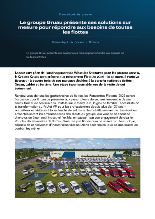 Rendez-vous de tous les gestionnaires de flottes, les Rencontres Flotauto2026 seront l’occasion pour Gruau de présenter aux prescripteurs du secteur l’ensemble de ses savoir-faire et de ses services. Installé sur le stand D35, le groupe familial – spécialiste de la transformation sur VU et VP pour les professionnels depuis plus de 137 ans – accueillera les visiteurs à la recherche de solutions de mobilité sur-mesure. Les équipes présentes seront les ambassadrices des atouts du groupe, qui vont de sa capacité d’innovation à son outil industriel flexible, en passant par son engagement de qualité. Pour les décisionnaires de flottes, Gruau se positionne comme un interlocuteur unique, capable de concevoir et d’industrialiser des solutions spécifiques, quelles que soient les contraintes métier.