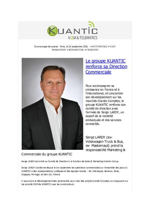Pour accompagner sa croissance en France et à l’international, et concentrer son développement sur les marchés Grands Comptes, le groupe KUANTIC renforce son comité de direction avec l’arrivée de Serge LARDY, un expert de la mobilité embarquée et des services connectés.