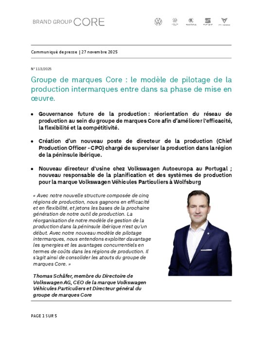 Le groupe de marques Core au sein de Volkswagen Group, qui désigne l'entité organisationnelle regroupant les marques à fort volume que sont Volkswagen, Škoda, Seat & Cupra et Volkswagen Véhicules Utilitaires, réoriente sa stratégie de production et met en place un réseau de production régional à haute performance.