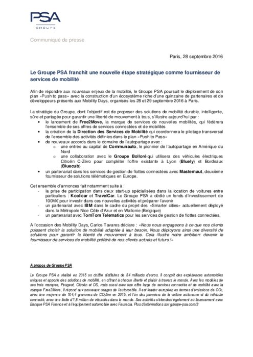 Déjà incluse dans le nouveau plan stratégique de PSA (marques Peugeot, Citroën et DS) à l'horizon 2021 annoncé en avril, la diversification du constructeur dans l'offre de mobilité au delà de la vente de véhicules marque "le début d'une grande transformation", a assuré M. Tavares lors d'une conférence de presse.