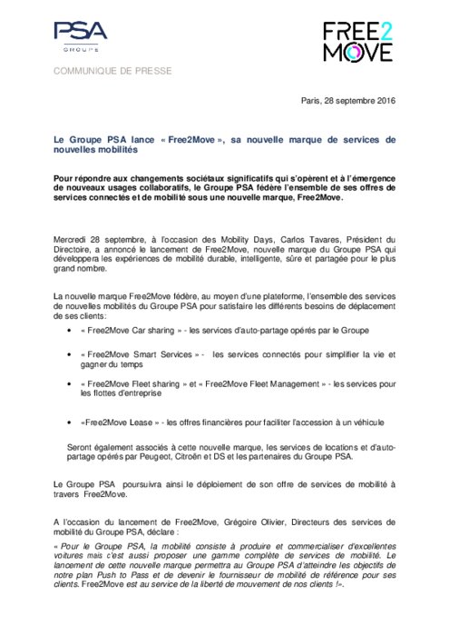 La marque "Free2Move" (libre de bouger) chapeaute aussi bien les services d'autopartage opérés par le groupe que les services connectés, les services pour les flottes d'entreprise et les offres financières.