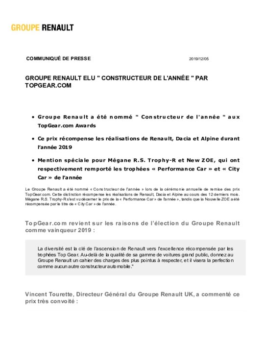 Le Groupe Renault a été nommé "Constructeur de l'année" lors de la cérémonie annuelle de remise des prix TopGear.com. Cette distinction récompense les réalisations de Renault, Dacia et Alpine au cours des 12 derniers mois. Mégane R.S. TrophyR s'est vu décerner le prix de la "Performance Car de l'année", tandis que la Nouvelle ZOE a été récompensée par le titre de "City Car" de l’année.