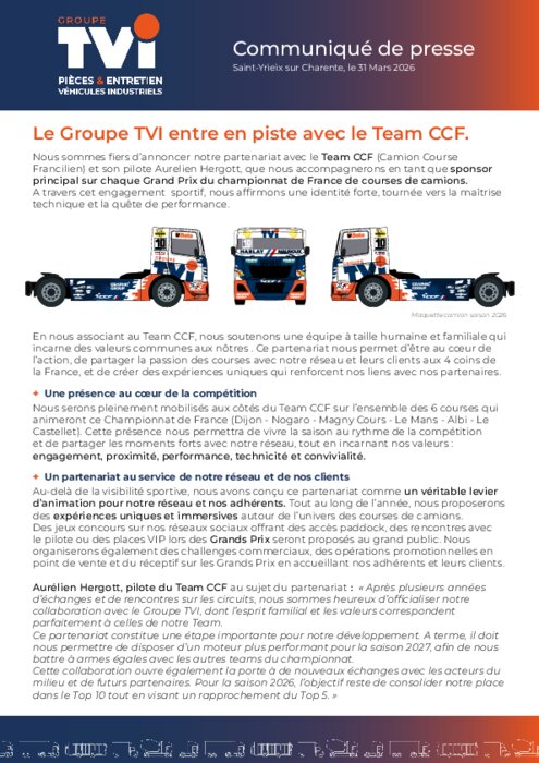 Distributeurs 31 mars 2026 - 12:34 Ce partenariat, ancré dans des valeurs d'engagement, de performance et de proximité, constitue pour le Groupe TVI une nouvelle étape dans l'affirmation de son identité et l'animation de son réseau d'adhérents à l'échelle nationale. PDF (2 Mo) Télécharger