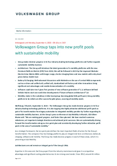 Le Groupe Volkswagen a réalisé des progrès décisifs dans ses quatre plateformes technologiques de pointe. Il exploite également des pools de bénéfices supplémentaires très attractifs dans le cadre de sa transformation de constructeur automobile historique en fournisseur de mobilité intégré en développant davantage son activité de mobilité durable.