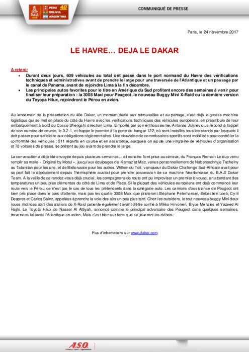 Au lendemain de la présentation du 40e Dakar, un moment dédié aux retrouvailles et au partage, c'est déjà la grosse machine logistique qui se met en place du côté du Havre avec les vérifications techniques des véhicules européens, en préambule de leur embarquement à bord du Cosco Shengshi direction Lima...