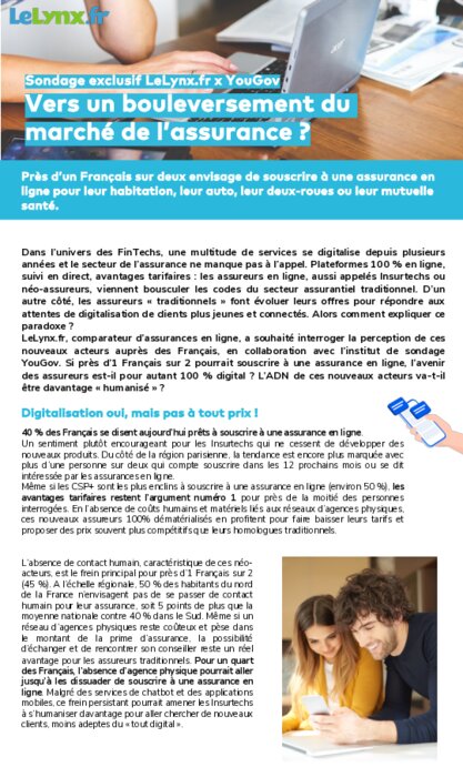 LeLynx.fr, comparateur d'assurances en ligne, a publié un sondage sur la perception des assurance en ligne auprès des Français, en collaboration avec l’institut de sondage YouGov.
