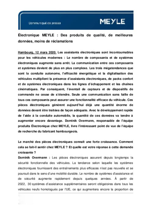 À partir de 2022, 30 systèmes d’assistance supplémentaires seront obligatoires dans tous les véhicules neufs homologués par l’UE, ce qui augmentera encore la proportion de composants électroniques dans les véhicules. C’est pourquoi, depuis plusieurs années, MEYLE élargit régulièrement et de manière ciblée son portefeuille électronique. Au cours des dernières années, nous avons pu lancer sur le marché près de 1 600 nouvelles pièces électroniques...