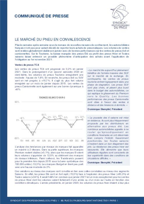 Malgré la menace de nouvelles mesures de confinement, les automobilistes français n’ont pas pour autant décidé de reporter leurs achats de pneumatiques. Les volumes de ventes sont restées stables en janvier avec de bonnes performances sur les ventes de pneus 4x4 et camionnettes. Sur le Tourisme, la baisse marquée des pneus été au profit des pneus hiver et toutes saisons laisse entrevoir un possible phénomène d’anticipation des achats avant l’application de l'obligation au 1er novembre 2021.