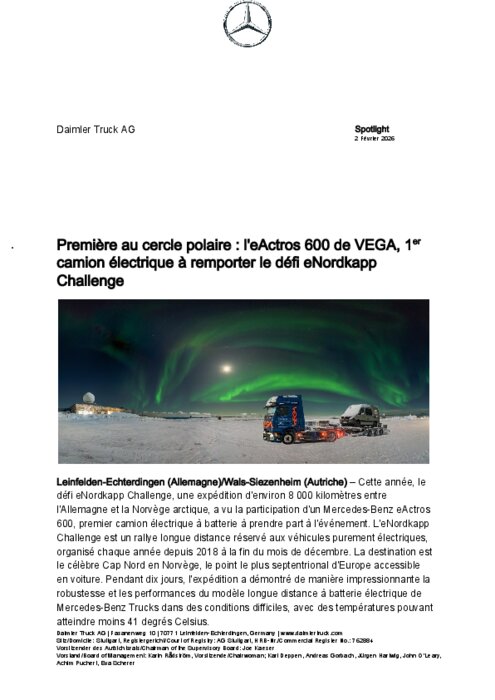 Constructeurs 02 février 2026 - 16:36 Cette année, le défi eNordkapp Challenge, une expédition d'environ 8 000 kilomètres entre l'Allemagne et la Norvège arctique, a vu la participation d'un Mercedes-Benz eActros 600, premier camion électrique à batterie à prendre part à l'événement. PDF (410 Ko) Télécharger CREDIT Mercedes