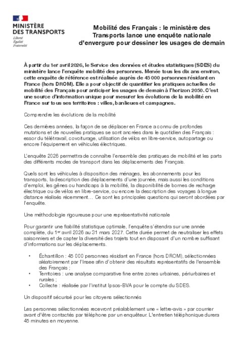 À partir du 1er avril, le Service des données et études statistiques (SDES) du ministère lance l’enquête mobilité des personnes. Menée tous les dix ans environ, cette enquête de référence est réalisée auprès de 45 000 personnes résidant en France (hors DROM). Elle a pour objectif de quantifier les pratiques actuelles de mobilité des Français pour anticiper les usages de demain à l’horizon 2050. C’est une source d’information unique pour mesurer les évolutions de la mobilité en France sur tous ses territoires : villes, banlieues et campagnes.