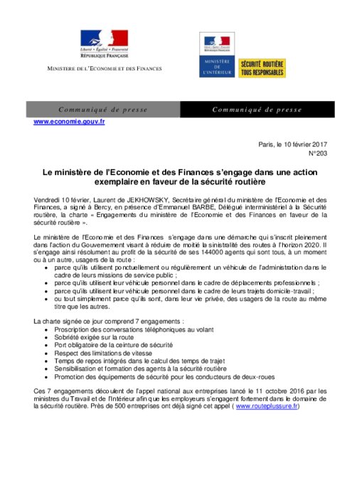 Le ministère de l’Economie et des Finances s’engage dans une démarche qui s’inscrit pleinement dans l’action du Gouvernement visant à réduire de moitié la sinistralité des routes à l’horizon 2020. Il s’engage ainsi résolument au profit de la sécurité de ses 144000 agents qui sont tous, à un moment ou à un autre, usagers de la route.