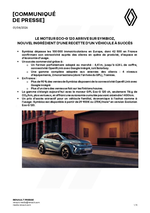 Constructeurs 01 avril 2026 - 09:58 Symbioz dépasse les 100 000 immatriculations en Europe, dont 42 500 en France confirmant son attractivité auprès des clients en quête de praticité, d'espace et d'économie d'usage. PDF (629 Ko) Télécharger renault