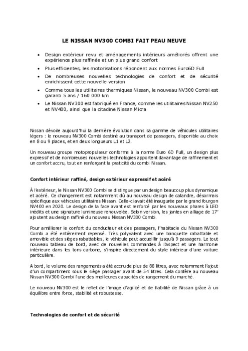 Nissan dévoile aujourd'hui la dernière évolution dans sa gamme de véhicules utilitaires légers : le nouveau NV300 Combi destiné au transport de passagers, disponible au choix en 8 ou 9 places, et en deux longueurs L1 et L2. Un nouveau groupe motopropulseur conforme à la norme Euro 6D Full, un design plus expressif et de nombreuses nouvelles technologies apportent davantage de raffinement et un confort accru, tout en renforçant la praticité du combi Nissan.