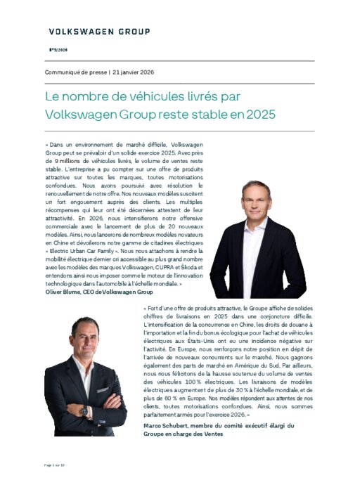 Constructeurs 21 janvier 2026 - 14:41 Le volume de ventes est en nette progression en Europe (+4%) et en Amérique du Sud (+12%). Conformément à nos prévisions, il s'inscrit à la baisse en Amérique du Nord (-10%) et en Chine (-8%) en raison d'un environnement de marché difficile. PDF (565 Ko) Télécharger credit Volkswagen