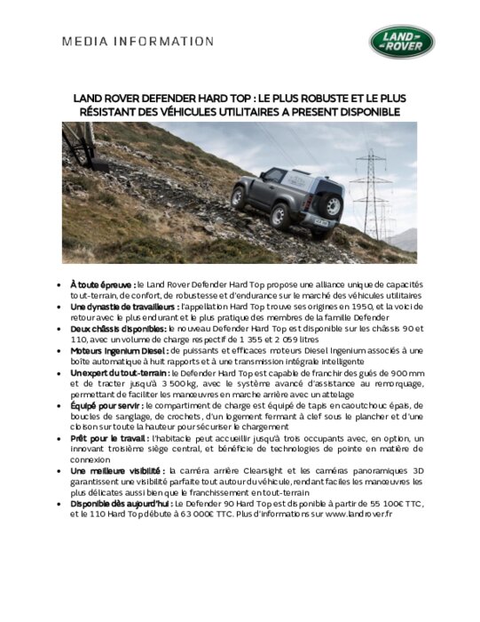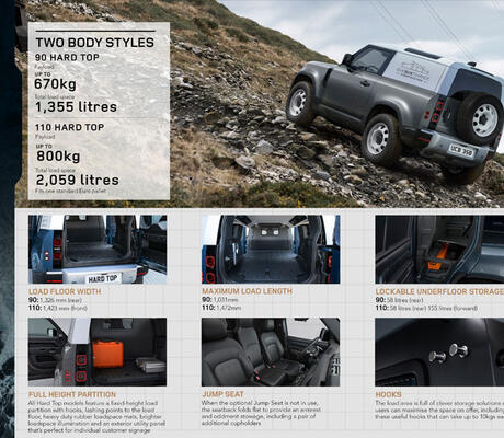 Le nouveau Land Rover Defender Hard Top introduit, sur le marché du 4x4 utilitaire, des capacités de franchissement à toute épreuve, de vraies qualités de polyvalence et de solidité, en plus d’une connectivité digne du 21e siècle et d’un confort premium. L’appellation Hard Top a toujours été synonyme d’un caractère franchisseur et de possibilités de transport dans les endroits les plus inattendus, depuis le lancement du premier Land Rover Hard Top, il y a 70 ans.