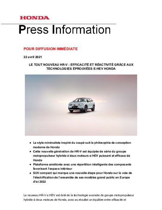 Le nouveau HR-V e:HEV est doté de la technologie avancée de groupe motopropulseur hybride à deux moteurs de Honda, avec au résultat un équilibre entre efficacité et réactivité. Ce SUV sub-compact s’intègre désormais à la gamme e:HEV (véhicule électrique hybride) de Honda, marquant une des ultimes étapes avant la réalisation de l’engagement de la marque à électrifier l’ensemble de ses modèles grand public européens d’ici 2022.