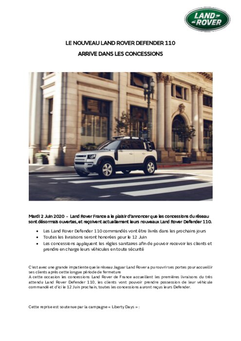 Constructeurs 02 juin 2020 - 14:18 Land Rover France a le plaisir d’annoncer que les concessions du réseau sont désormais ouvertes, et reçoivent actuellement leurs nouveaux Land Rover Defender 110. PDF (328 Ko) Télécharger