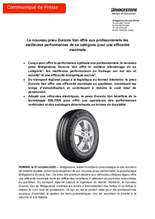 Conçu pour offrir la performance optimale aux professionnels, le nouveau pneu Bridgestone Duravis Van offre le meilleur kilométrage de sa catégorie, les meilleures performances au freinage sur sol sec et mouillé et une efficacité énergétique accrue. Du transport régional jusqu’à la logistique du dernier kilomètre, le pneu Duravis Van offre une efficacité maximale au quotidien, minimisant les temps d’immobilisation et contribuant à réduire le coût total de possession.